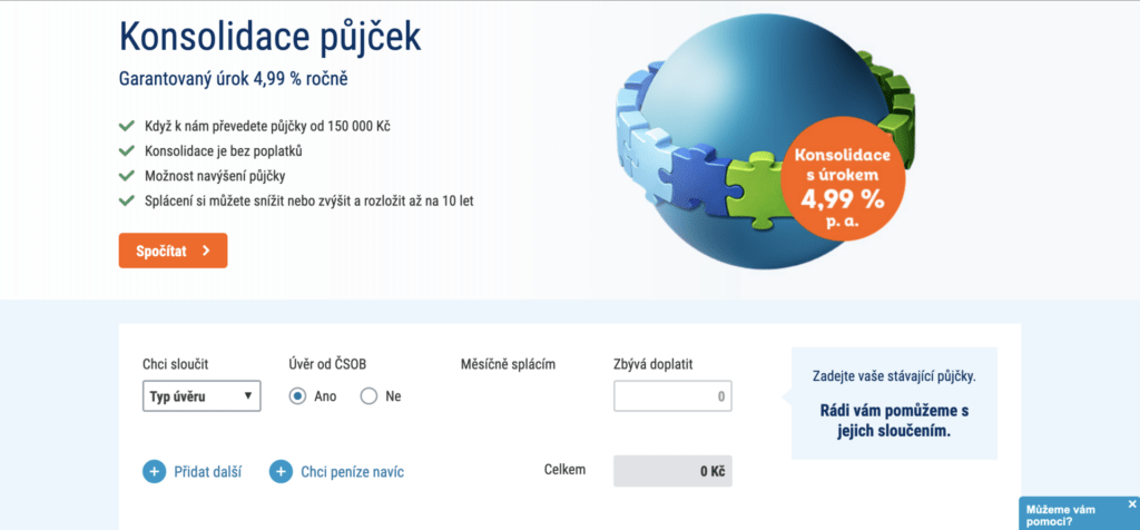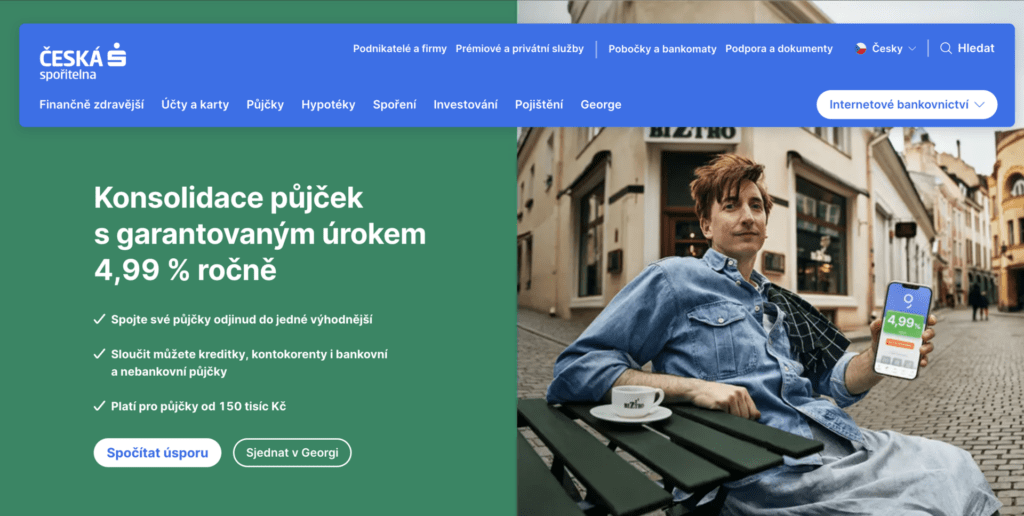 • Česká spořitelna – konsolidace slučující bankovní i nebankovní úvěry, kreditky a kontokorenty; při řádném splácení odpouští vybrané splátky; sjednání přes aplikaci George; splatnost až 120 měsíců.