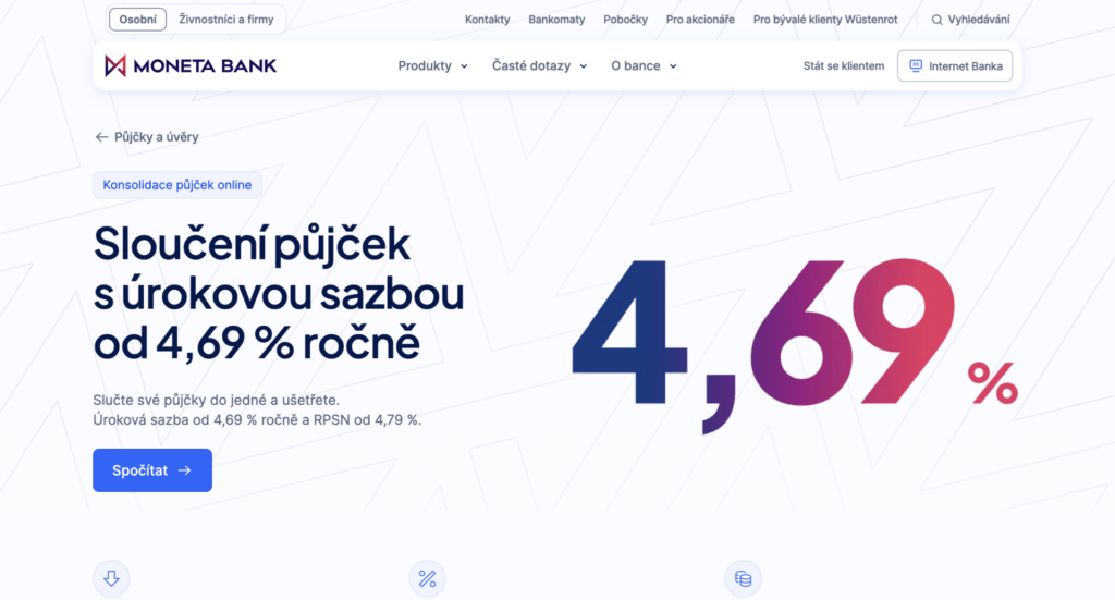 • MONETA Money Bank – konsolidace s úrokovou sazbou od 4,69 % a RPSN od 4,79 %; sjednání online i na pobočce; konsolidace nad 1 000 000 Kč pouze osobně.